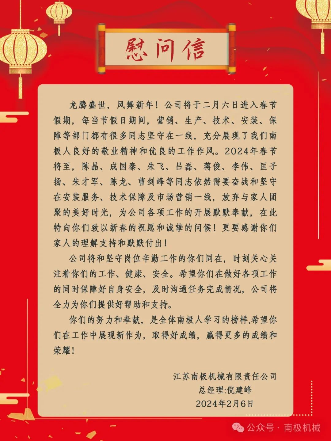 2月6日上午,江蘇南極機械有限責任公司王建海副總代表公司對春節假期期間為滿足市場需求依然堅守和奮戰在安裝服務和技術保障一線的骨干代表呂磊、蔣俊、朱飛、陳晶、成國泰、李偉等員工家庭進行走訪慰問,送去公司的誠摯關愛與新春祝福,營造溫馨、祥和的節日氛圍,同時感謝員工家屬的理解支持和默默付出。
